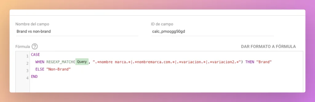 - Introduce en la fórmula las diferentes variantes de tu nombre de marca. Te recomiendo que compruebes en Search Console cómo buscan tu marca ( a veces te sorprendes).