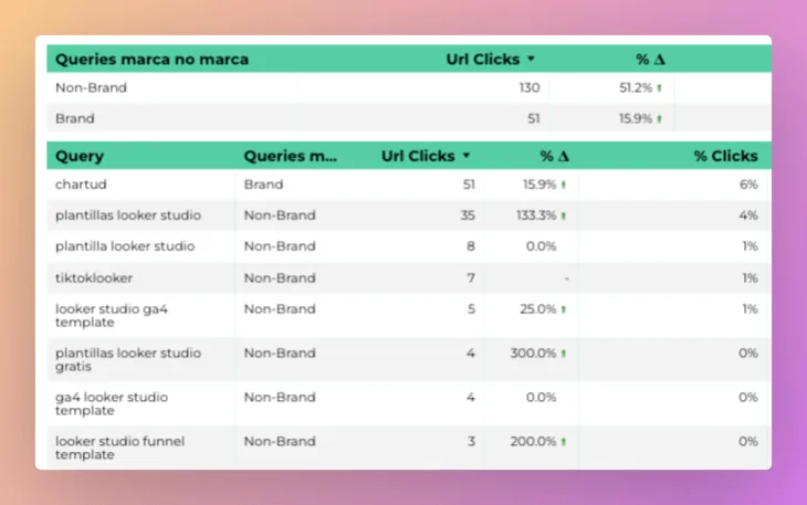 Siempre que trabajes con informes o dashboards de SEO ten en cuenta la importancia de separar las queries de marca de las que no lo son para tener un análisis más eficaz y veraz.