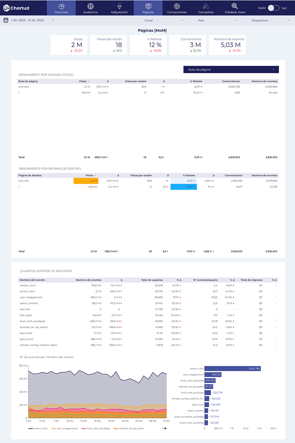 - Tabla con el rendimiento por páginas con filtro de Canales y Dispositivos, además de filtro para elegir la(s) página(s)