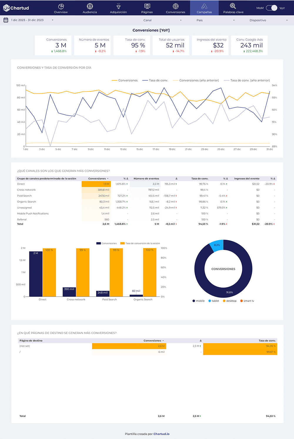 - Conversiones y tasa de conversión por canal con gráfico de barras para un análisis más rápido.