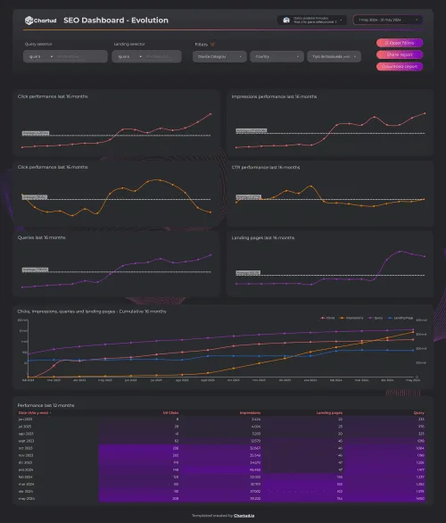 - Clics, impresiones, queries y landing pages unido en serie temporal últimos 16 meses.