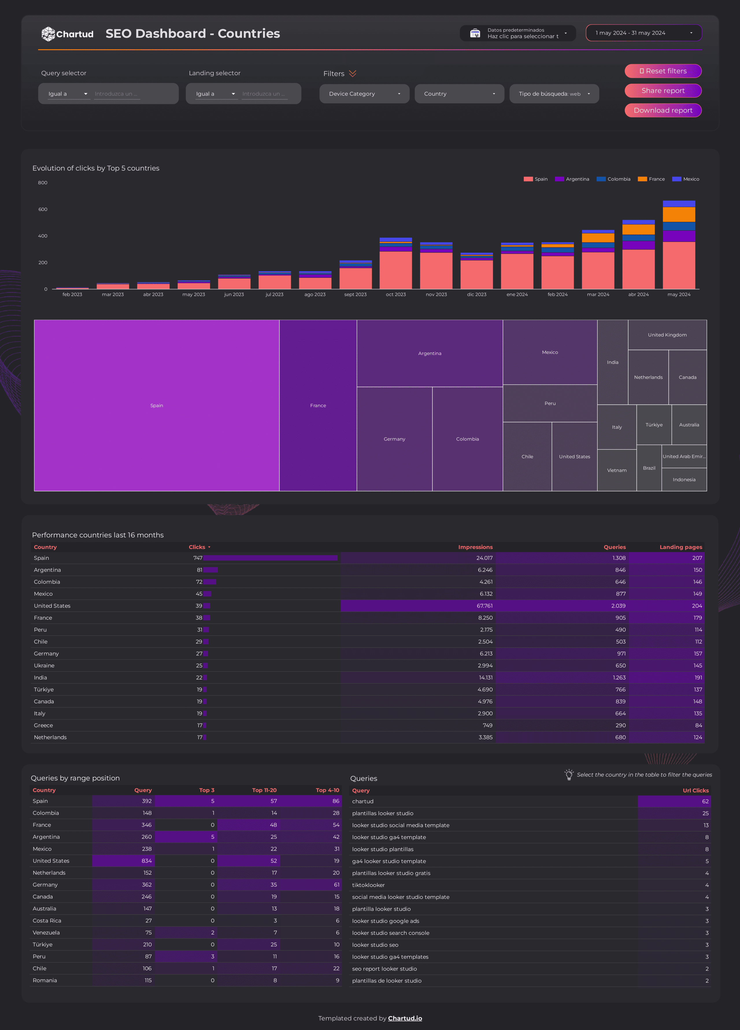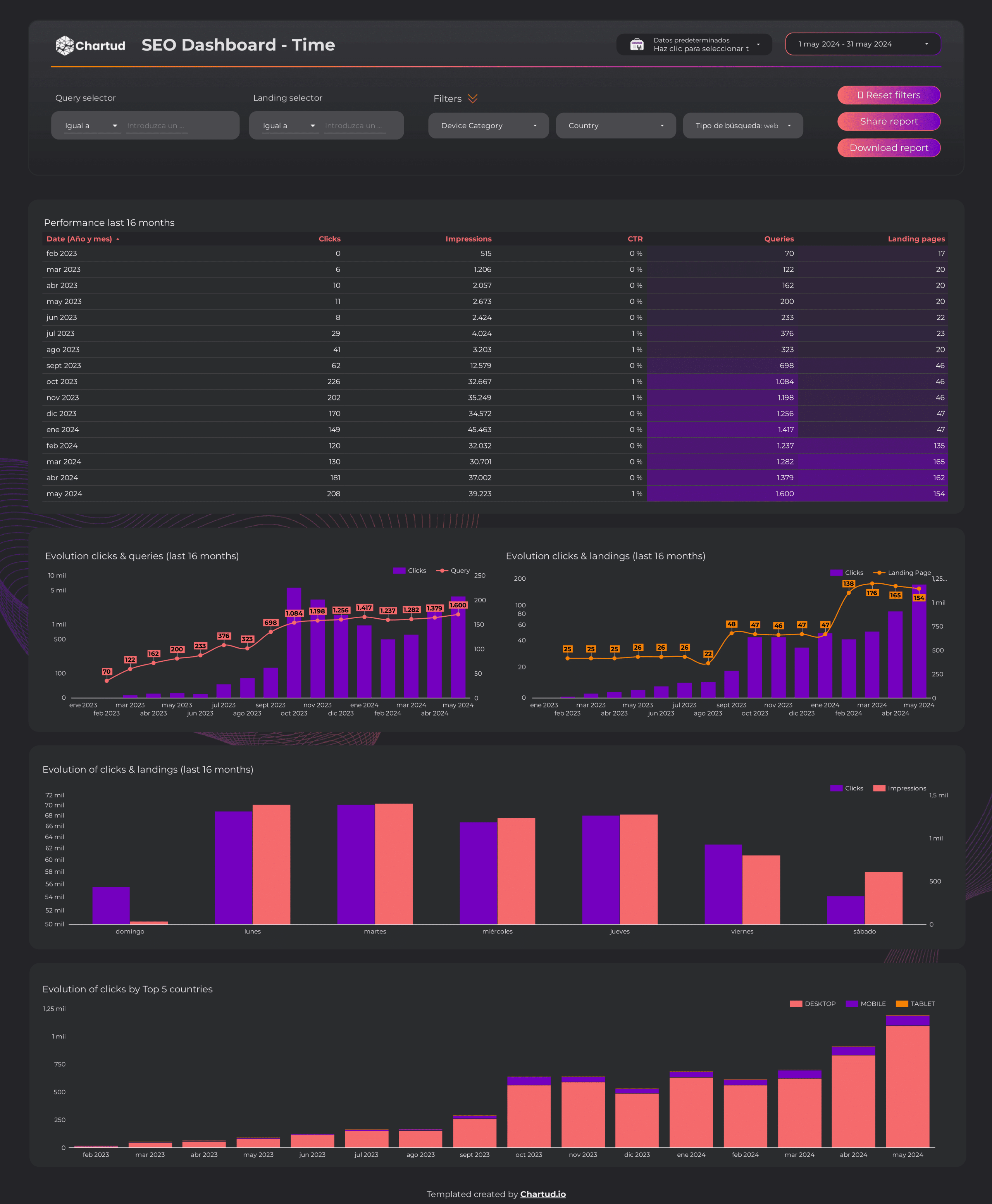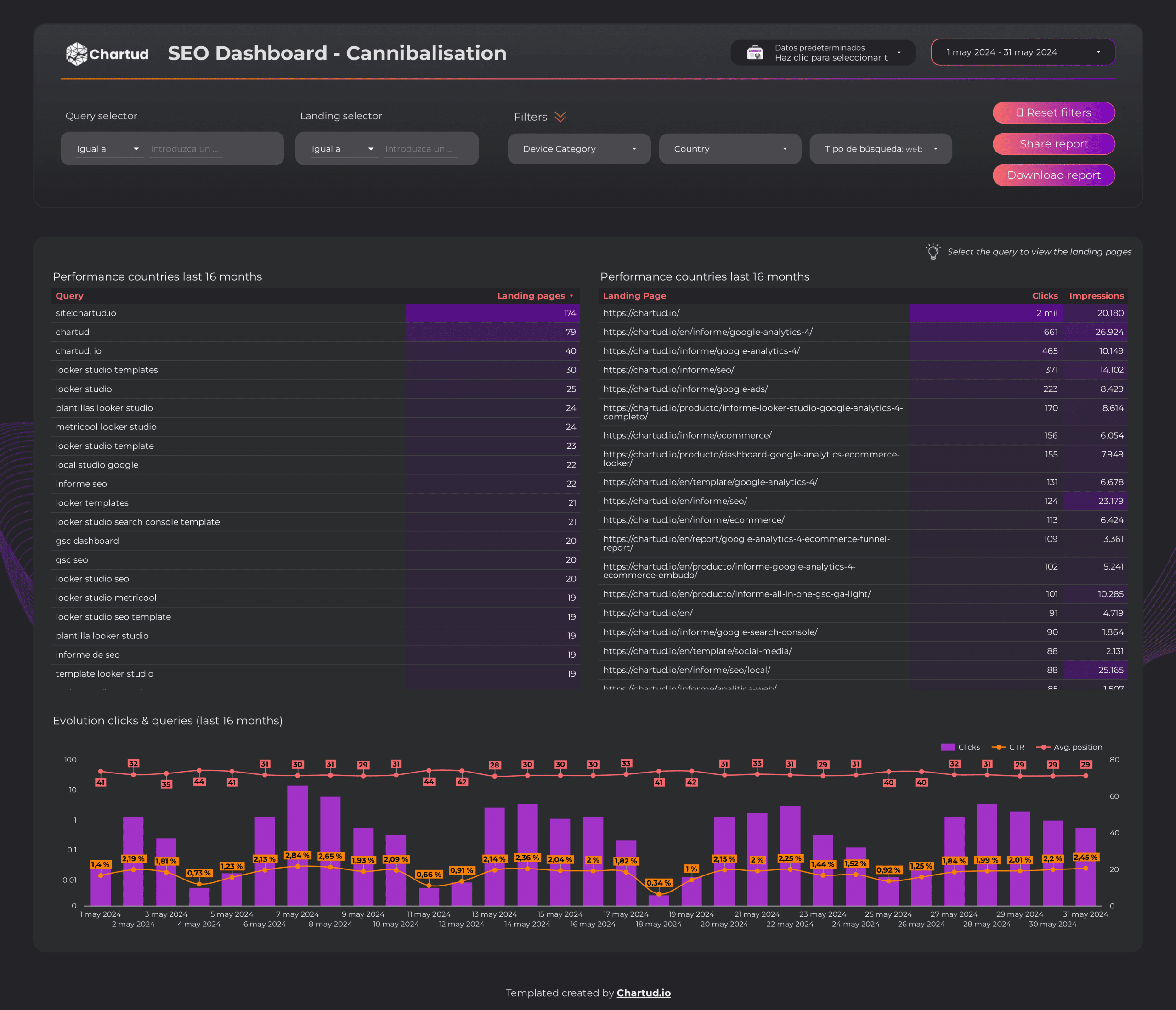 Todas las páginas cuentan con una sección de filtros para elegir query, landing page, dispositivo, país o tipo de búsqueda. Además de botones para resetear filtros, compartir el informe o descargarlo en PDF. Al usar estos filtros los datos de las páginas se modifican.