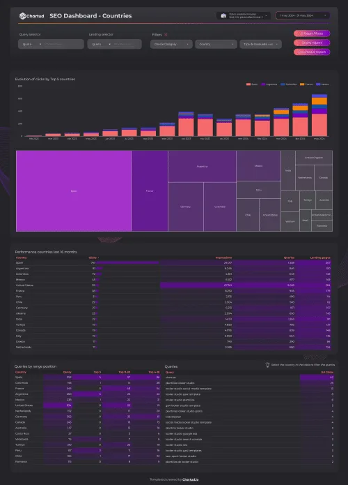 - Distribución de queries por rango de posiciones y por país (Top 3, 10, 20 y 100)