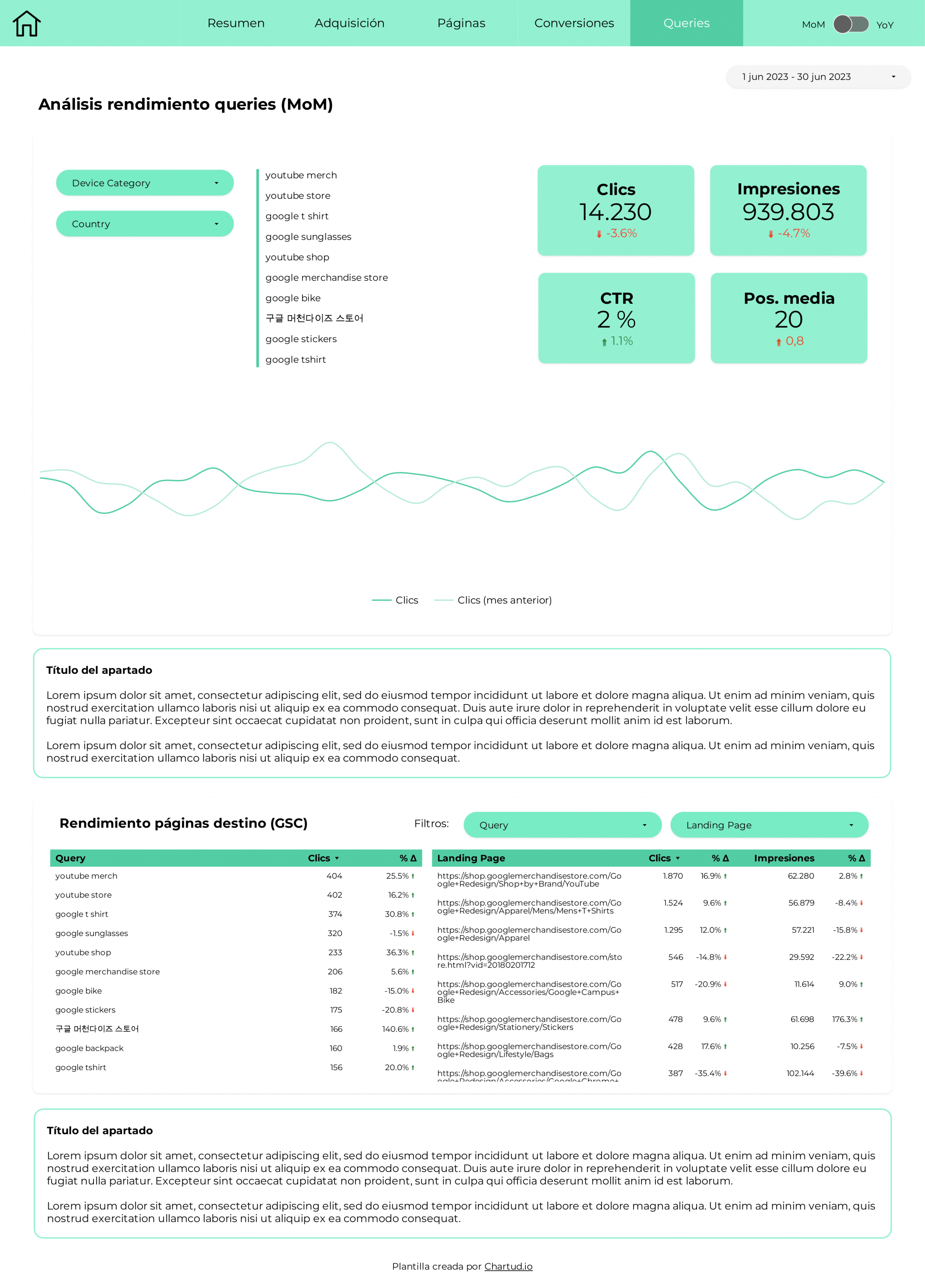 - Top queries y principales métricas pudiendo filtrar por dispositivo y país