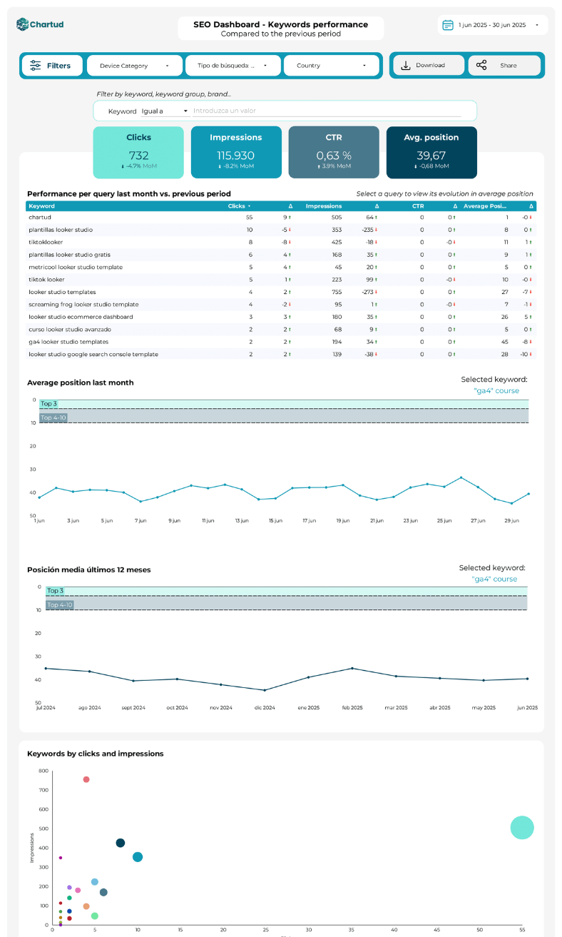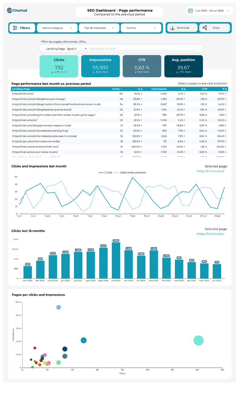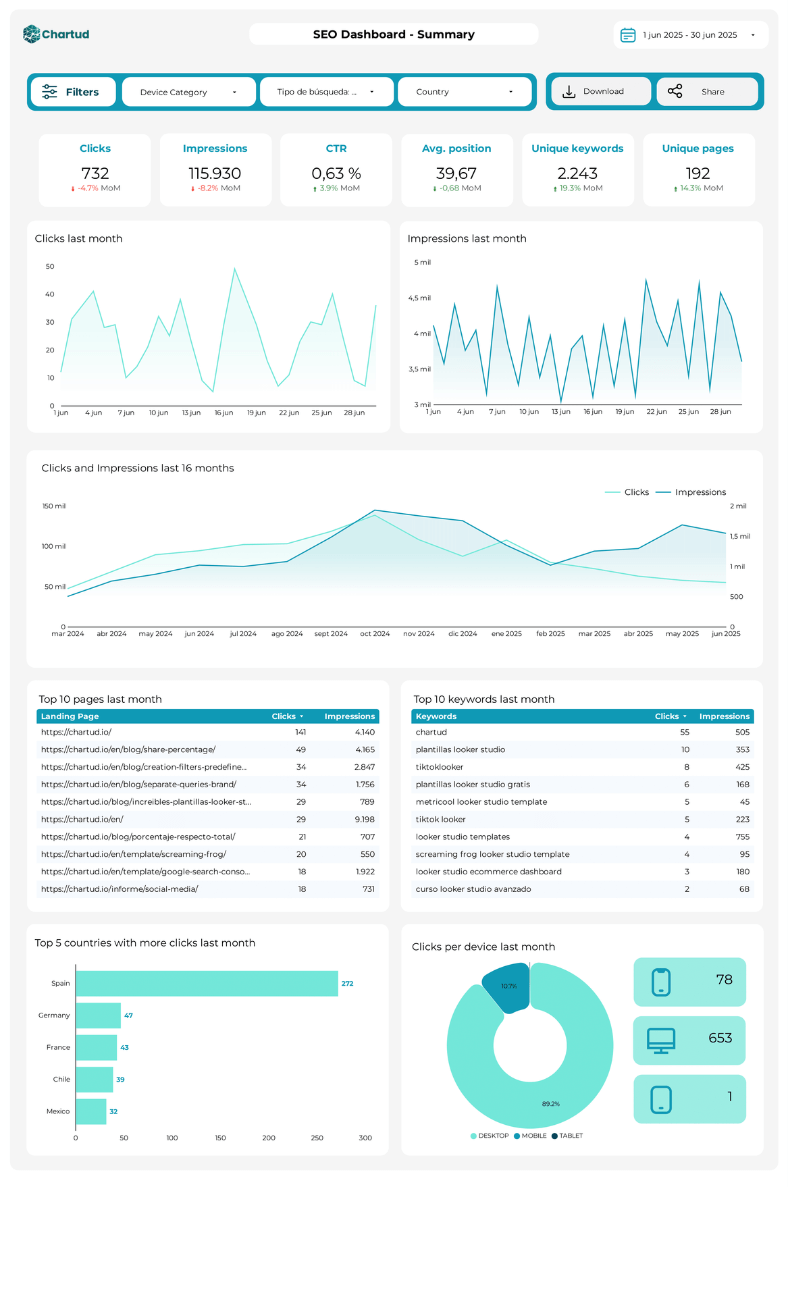 - Métricas comparadas con el periodo anterior: clicks, impresiones, CTR, posición media, keywords únicas, páginas únicas